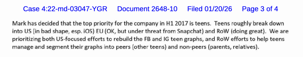 Heavily-redacted internal document – “one of the key goals of the Youth Growth team is to get teens onto Facebook and to stay there.”
