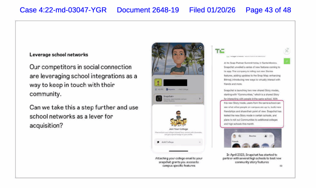 Heavily-redacted slide deck includes suggestion that Instagram could “use school networks as a lever for acquisition” to better compete with Snap and a desire to “position Instagram as integral to navigating school relationships, especially during transition periods” like graduating/changing schools.