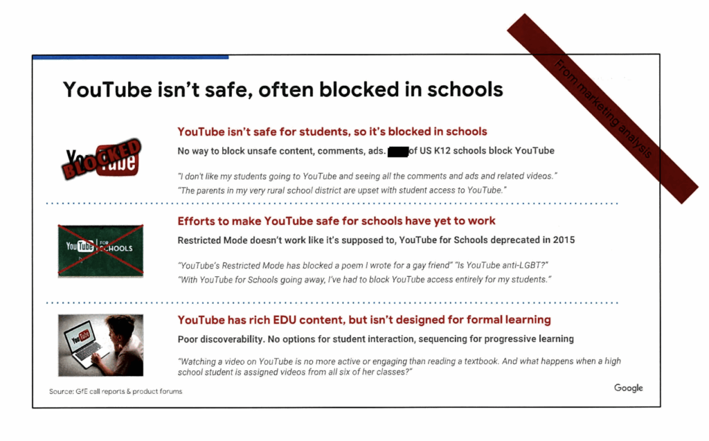 Slidedeck reviewing G Suite for Education that includes the statements “YouTube isn’t safe, often blocked in schools.” “No way to block unsafe content, comments, ads.” “Efforts to make YouTube safe for schools have yet to work.”