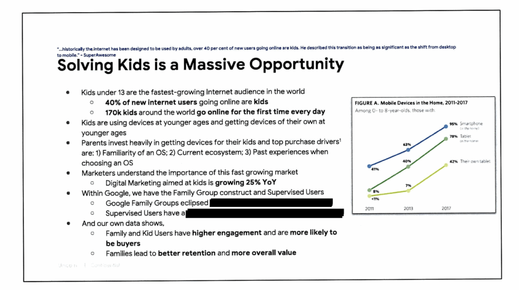 Google document detailing a business plan to expand products and access to children. “Onboarding kids into Google’s Ecosystem leads to brand trust and loyalty over their lifetime”