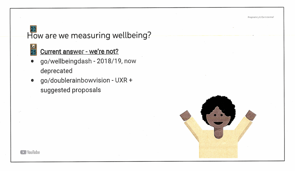 Slidedeck with editor comments discussing user wellbeing. “Status Quo Take a Break and Bedtime reminders are currently only available on Android/iOS, despite [redacted] of YTT taking place on Web.” “Currently most of our wellbeing tools require going into settings with the intention to use them.” “Do people even know we have these tools? How many people actually use them?” “How are we measuring wellbeing? Current answer – we’re not?”