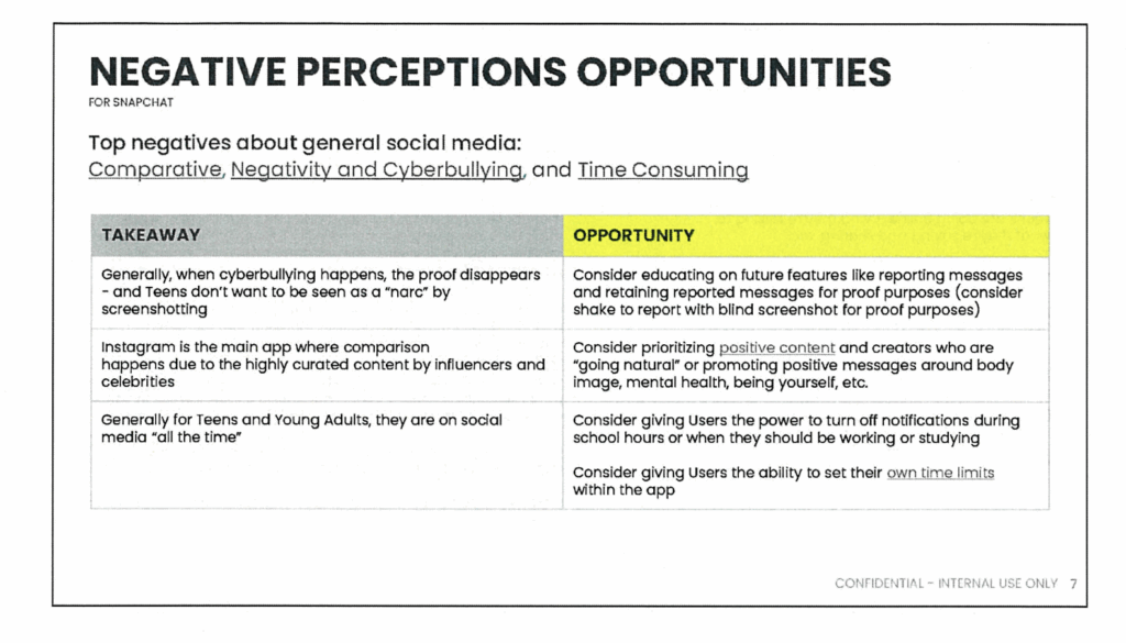 Includes a slide listing design opportunities to address “negative perceptions” about youth and social media, few to none of which were ever adopted.