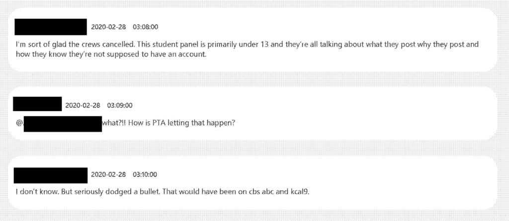 Heavily-redacted employee conversation discussing an event held by TikTok in conjunction with the National PTA (“PTA”) and the Family Online Safety Institute (“FOSI”). One chat participant says that they are happy that news crews did not show up to the event because “This student panel is primarily under 13 and they’re all talking about what they post why they post and how they know they’re not supposed to have an account.” Another comment says “a parent asked ‘ how old were you when you started using social media.’ All of them said btwn ages 8-12 and admitted to lieing about their birthdate to get around it. One girl said she’s 20 on Instagram”