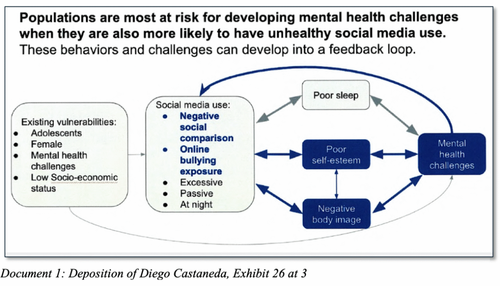 - “Populations are more at risk for developing mental health challenges when they are also more likely to have unhealthy social media use.” – Internal slides