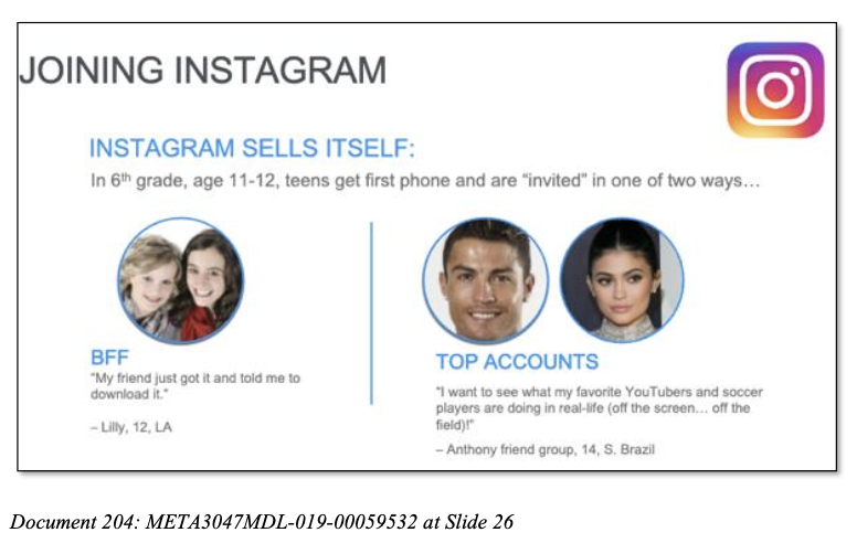 - Meta: “Instagram sells itself” to 6th graders ages 11-12 – Internal slides
