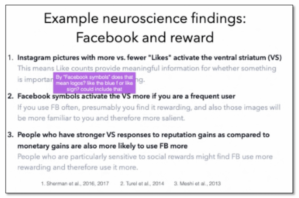 - “People who are particularly sensitive to social rewards might find FB use more rewarding and therefore use it more.” – Internal slides, 2018